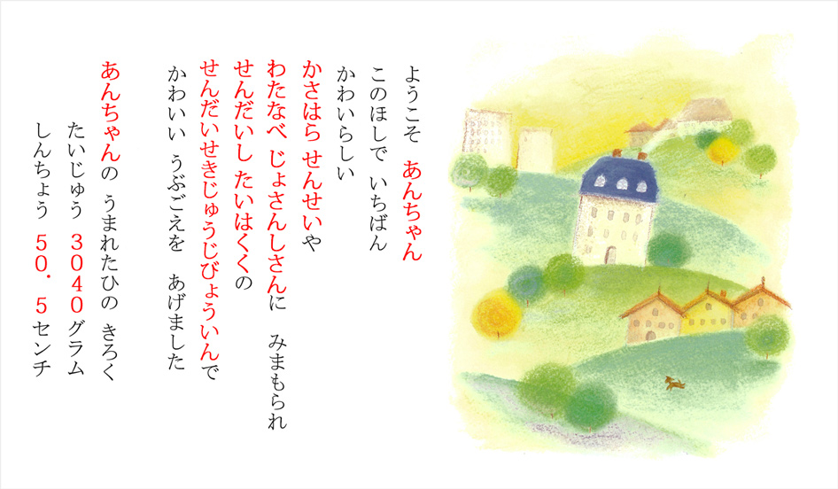 赤ちゃん『Baby’s Book』は、ママ・パパ、おばあちゃん・おじいちゃんからの大切なメッセージをお子様に伝えることができます。優しく暖かみを感じる絵と文章で、お子様、ご家族にとって一生の宝物となるメモリアルブックです。