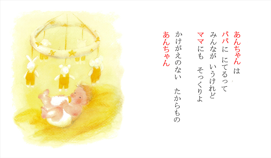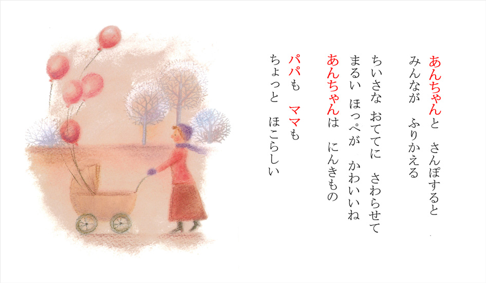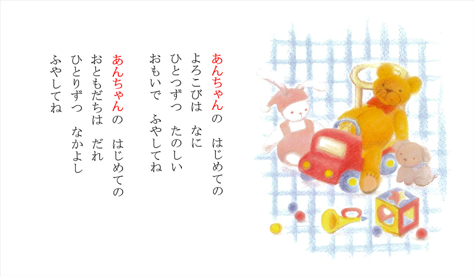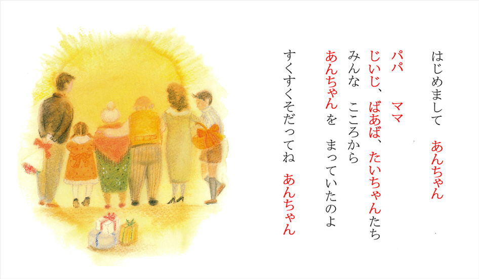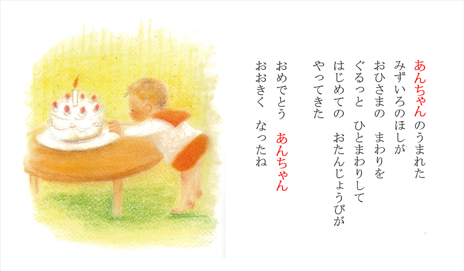 赤い文字の部分がオリジナル部分です。実際の絵本では、黒い文字になります。