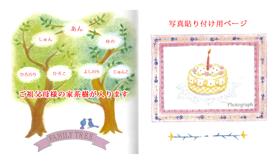 赤ちゃんのお名前、身長、体重、出生産院名など、出生時の記録が入るのはもちろんのこと、メッセージ欄や、写真を貼るスペースも設けています。写真は4枚貼ることができ、成長の記録(ハイハイ、初節句)を残すこともできます。ママ・パパ、おばあちゃん・ おじいちゃんも物語に登場します。 またファミリーツリー(家系図)を記入するページもついており、ご家族の一生の宝物になるメモリアルブックです。