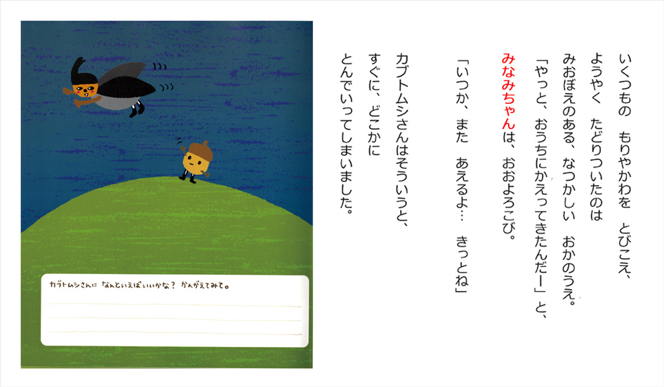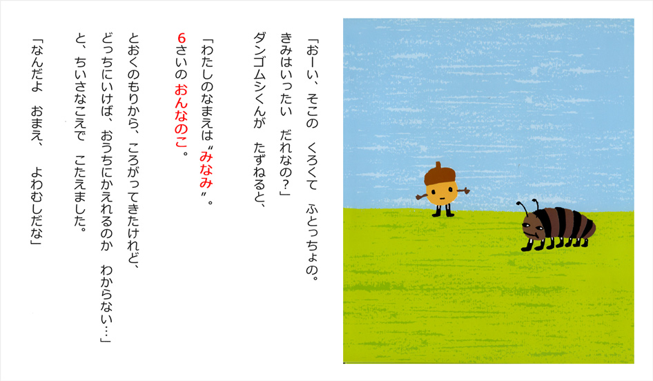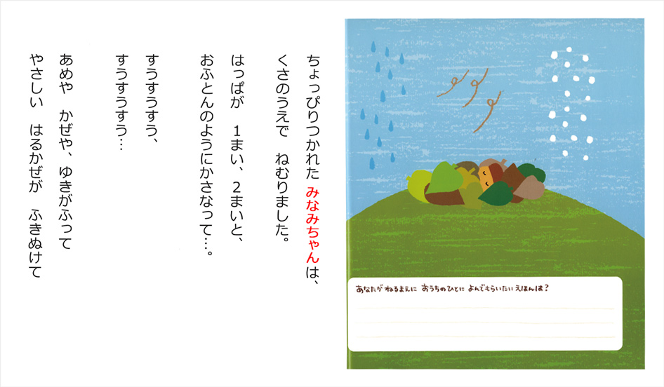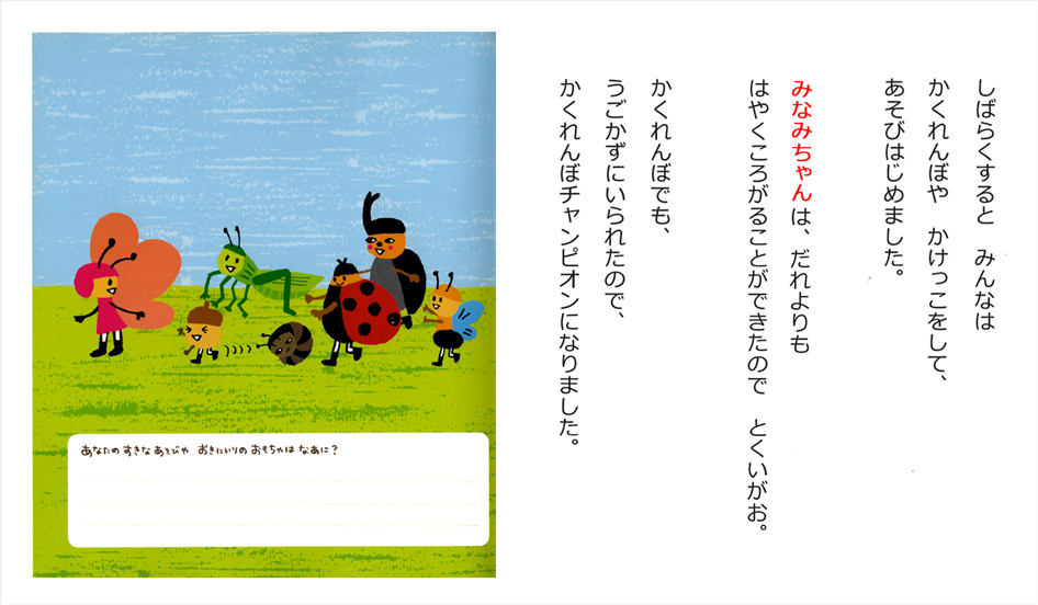 赤い文字の部分がオリジナル部分です。実際の絵本では、黒い文字になります。